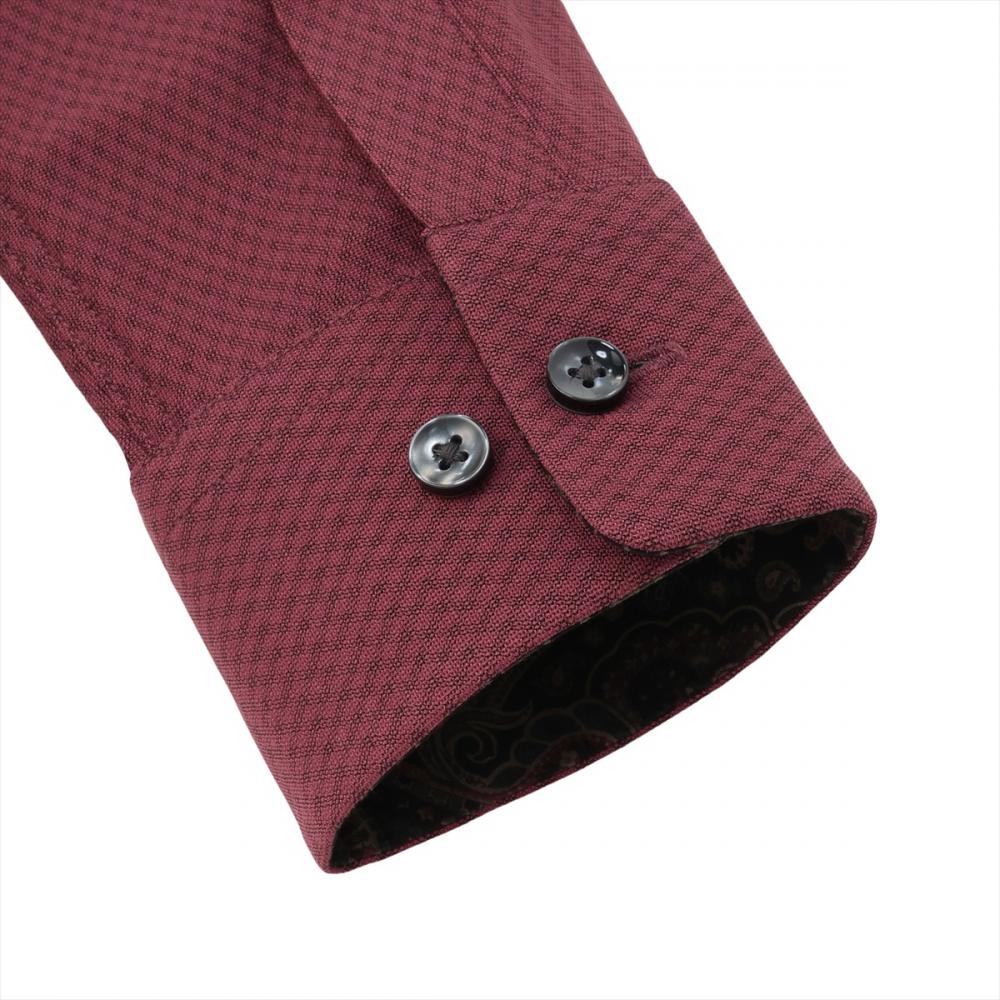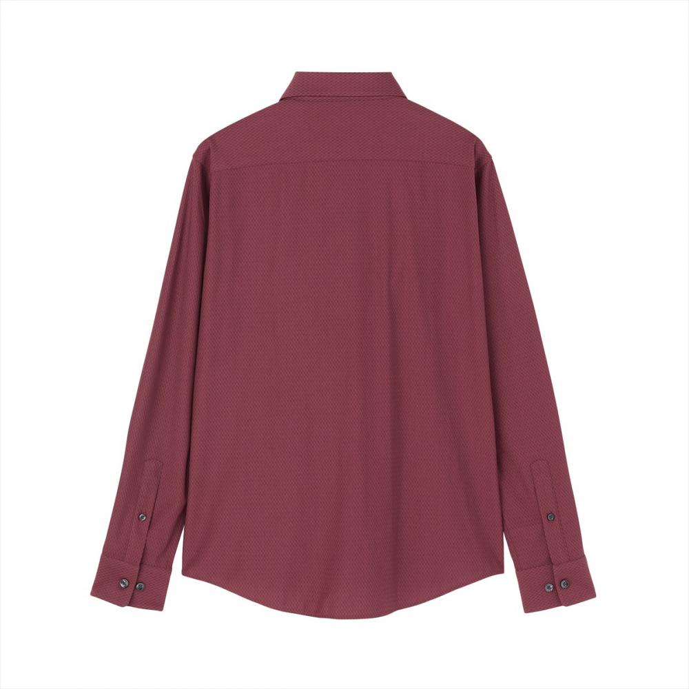 台衿内側とカフス裏にプリント別生地を 配してモード感を強調したデザインは すっきりしたシルエットで、タックイン・ アウトどちらでも洗練した雰囲気に。