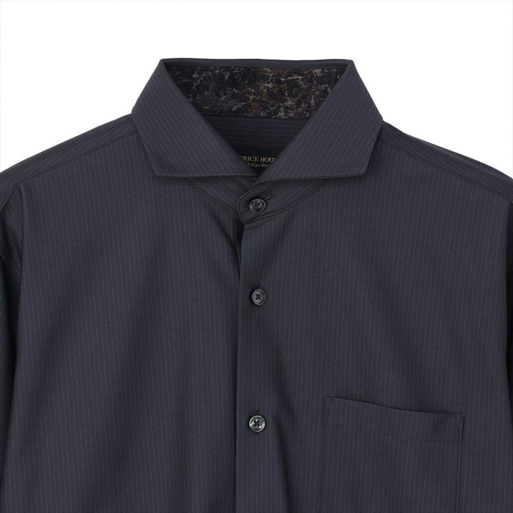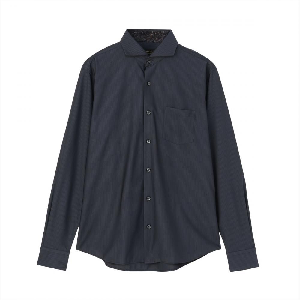 台衿内側とカフス裏にプリント別生地を 配してモード感を強調したデザインは すっきりしたシルエットで、タックイン・ アウトどちらでも洗練した雰囲気に。