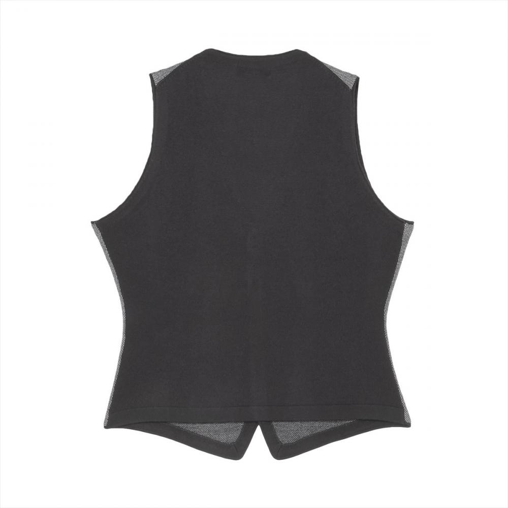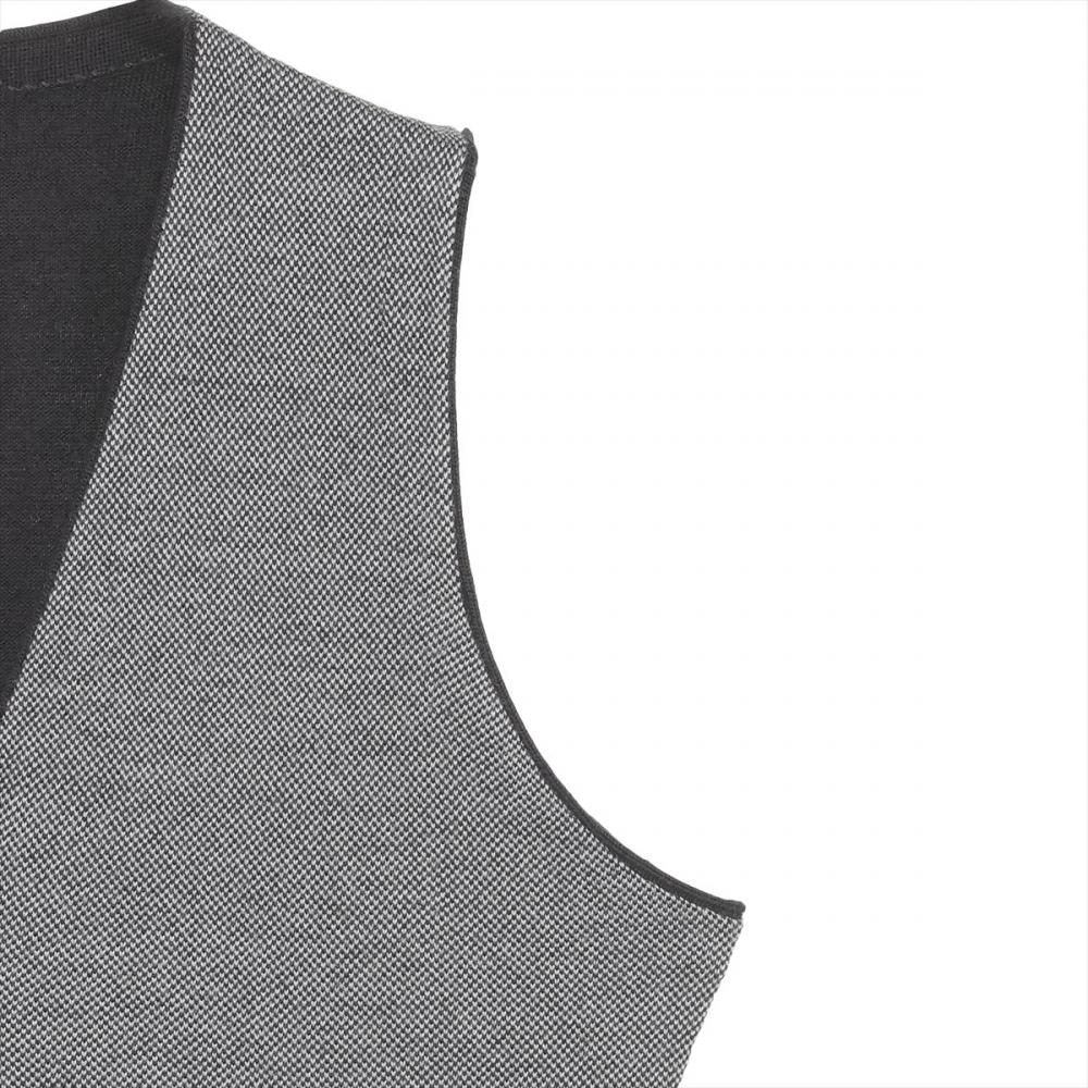 前身頃はバーズアイ柄生地、後身頃は 無地と組み合わせた前開きジレ。