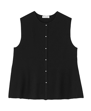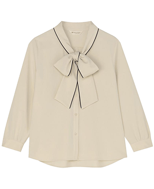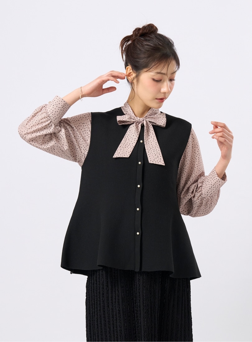 ボウタイブラウスにペプラムベストをレイヤードさせることで女性らしいスタイルに。タイトなスカートとの相性◎