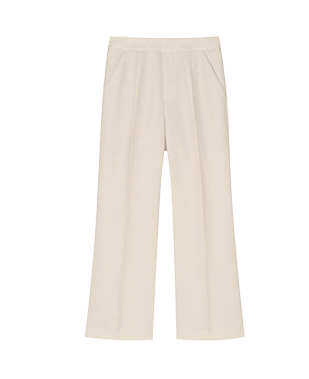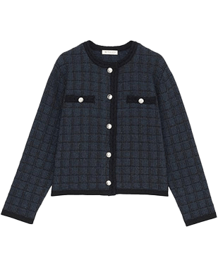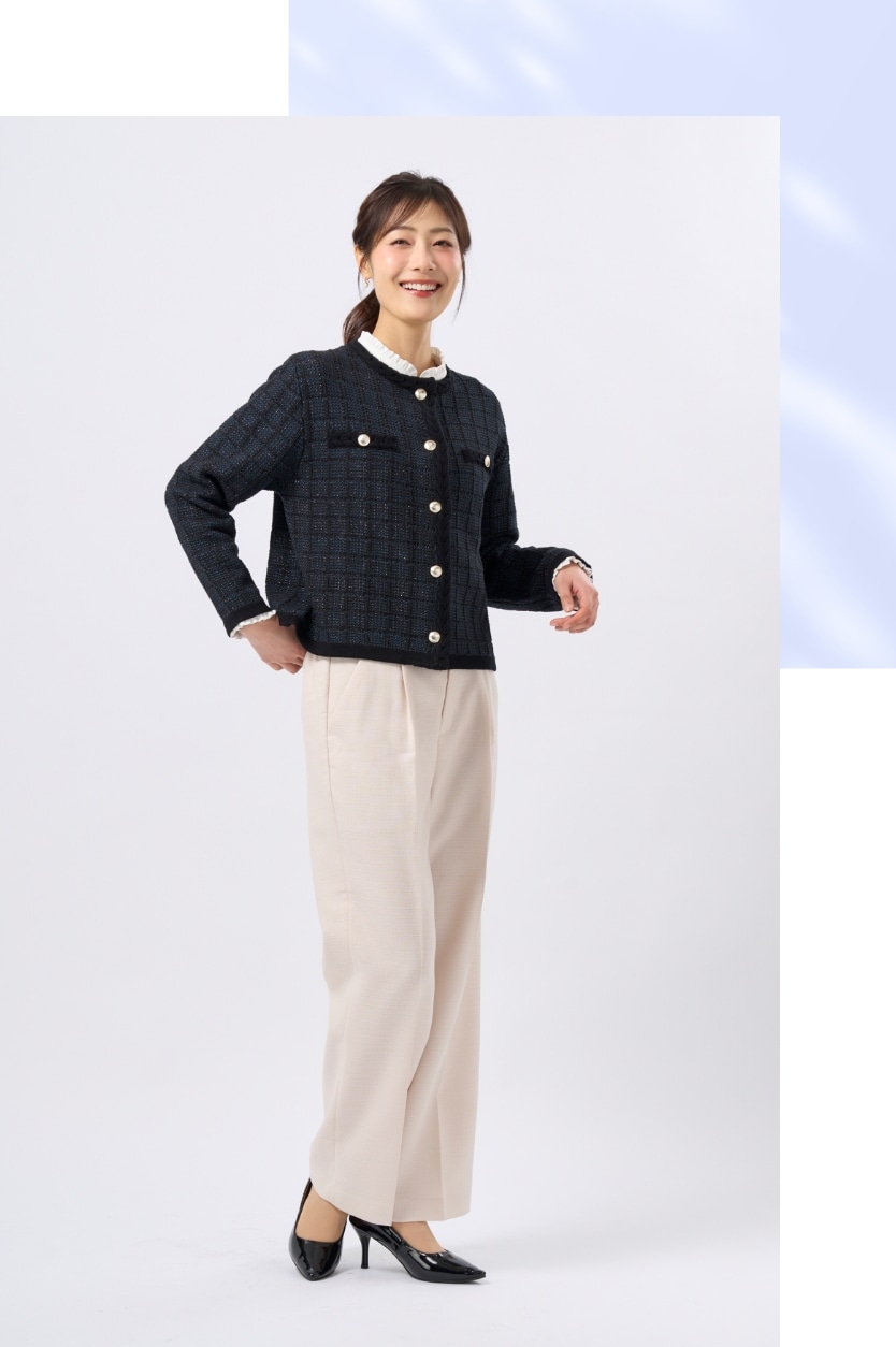 清潔感のあるパンツにノーカラーニットジャケット。きちんと感がありながら柔らかな印象に。