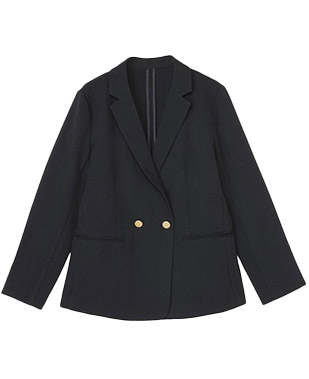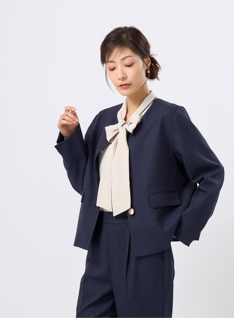 ネイビーのノーカラージャケットのセットアップはきちんと感がありオケージョンスタイルにおすすめ。