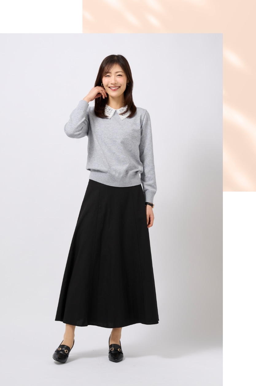 サラッと感のあるスカートにスニーカーを合わせればカジュアルすぎない大人っぽい休日スタイルに。