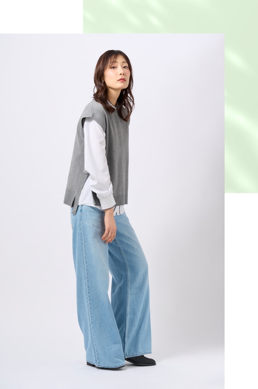 抜け感のあるニットベストがデニムとの相性もよくリラックスしたラフスタイルに。