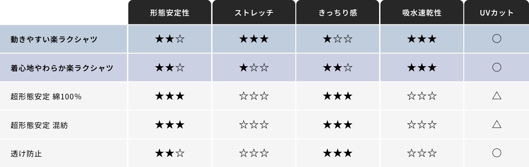 ストレッチ性があり着やすいです。汗をかいても乾きが早く、特に汗ばむ季節は重宝します。